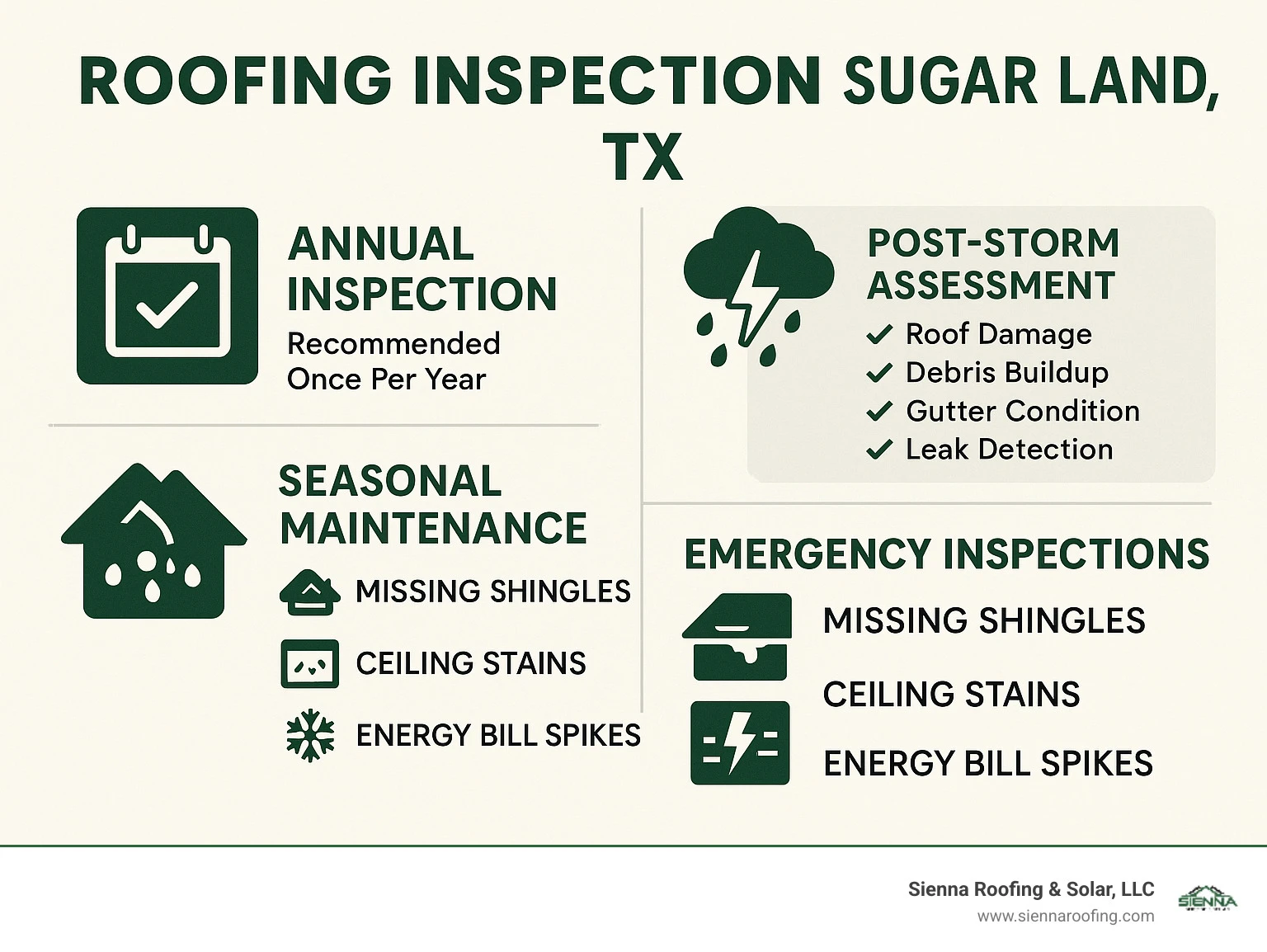 Roofing inspection Sugar Land TX services are essential for protecting your home from Texas weather extremes and preventing costly emergency repairs. Most roofing experts recommend scheduling professional inspections at least once yearly, with additional checks after major storms.